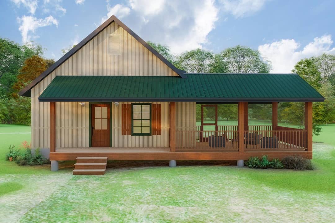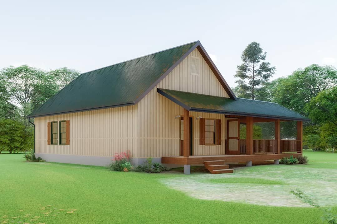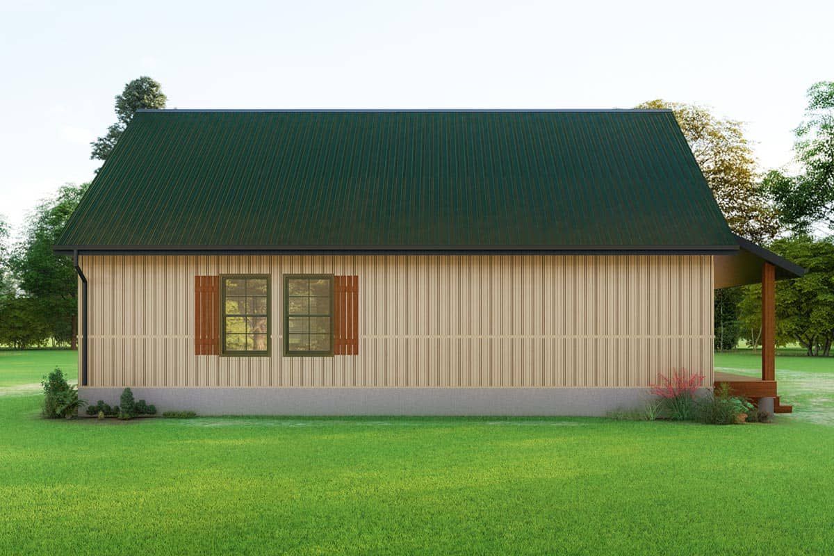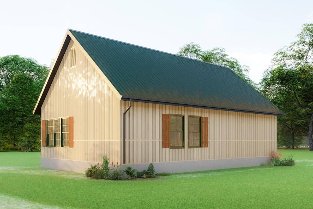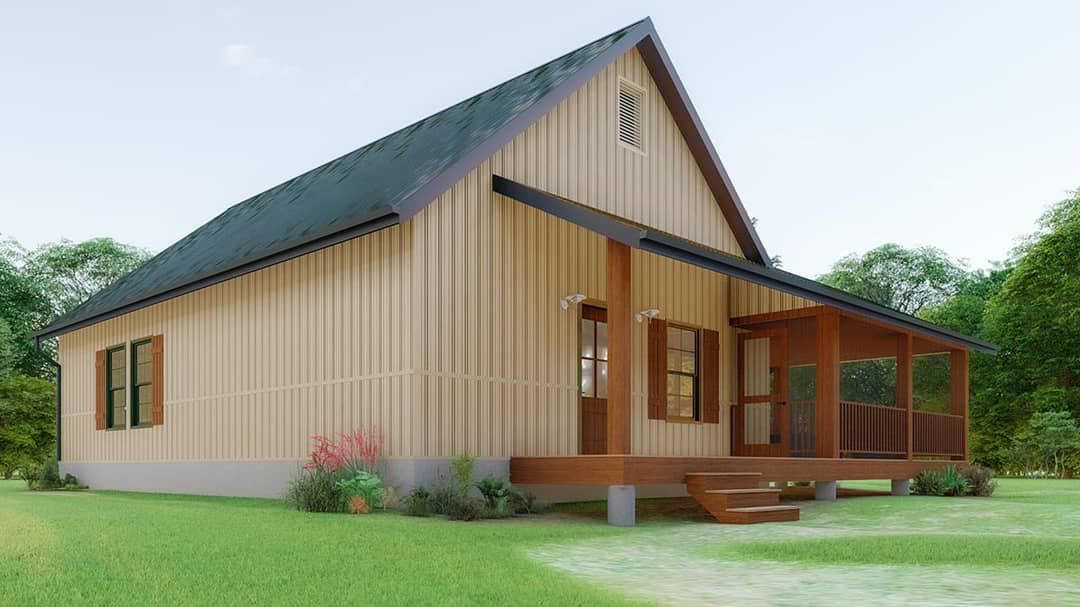 This plan is offered with a metal-building option (PEMB) in mind—making it well-suited for rapid build or rural settings. Exterior walls can be upgraded to 2 × 6 framing for enhanced insulation performance. 10The efficient layout, modest bedroom count and open plan minimize waste space and simplify mechanical and plumbing runs—beneficial for both build cost and long-term operation.