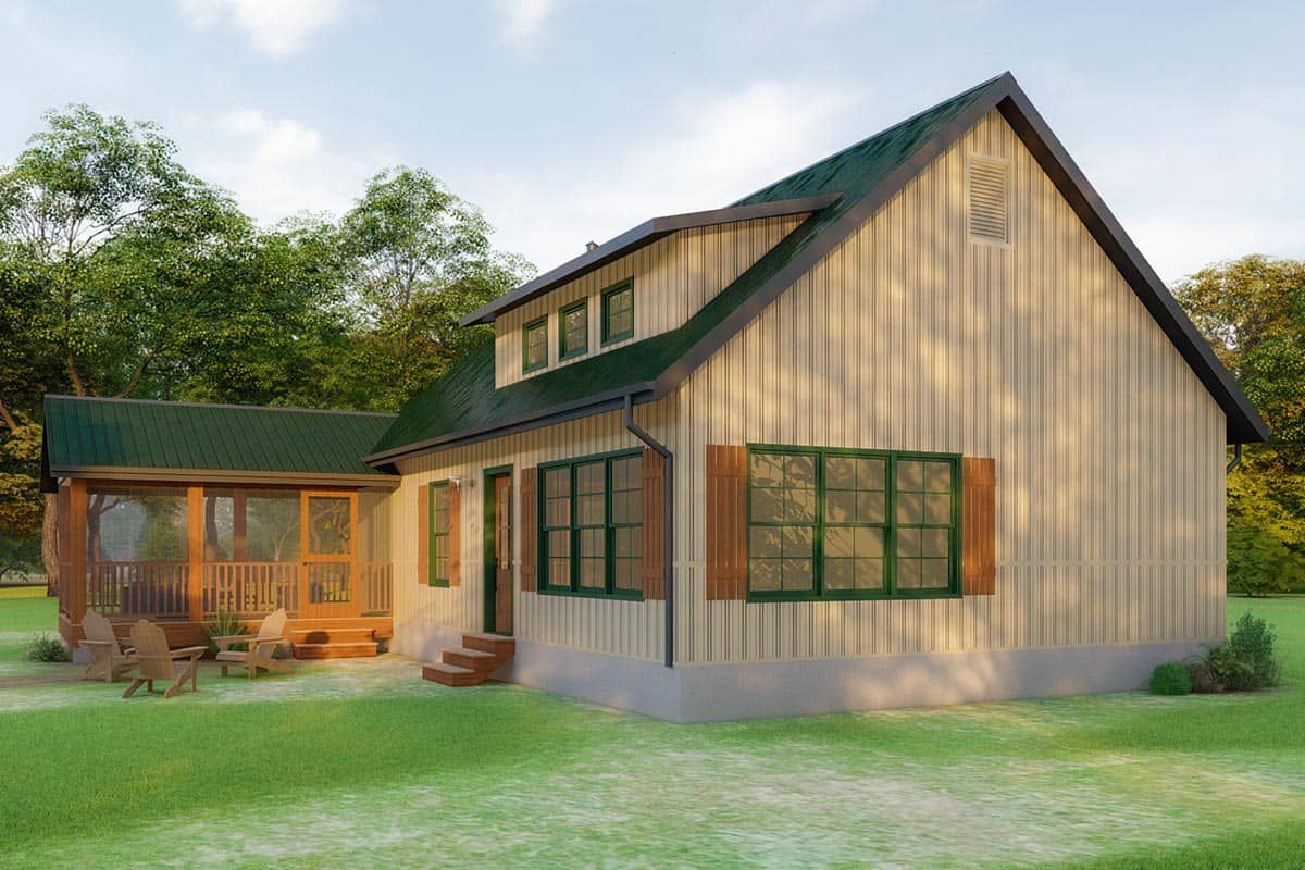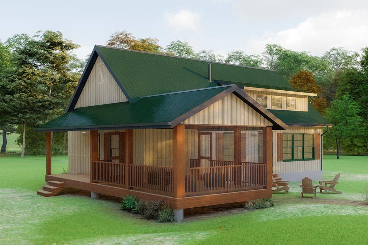 The cottage spans **42′ wide × 46′ deep**, creating a broad yet manageable footprint. 1 The design features a steep **10:12 roof pitch** on the primary roof, with a secondary **6:12 pitch** on adjoining elements, lending visual height and rustic character. 2The exterior style blends natural materials such as timber beams, board-and-batten siding, and stone or metal accents—evoking a rugged yet elegant countryside aesthetic. A large screened porch (approximately **219 sq ft**) provides outdoor living protected from insects and weather. 3