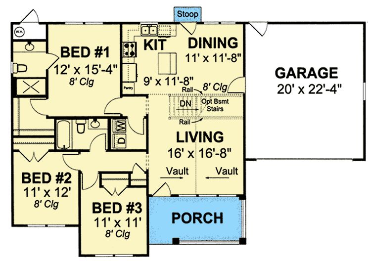 With three bedrooms and two full baths in a compact 1,286 sq ft footprint, the plan offers a rare blend of practicality and modest size—ideal for small families or downsizing couples.