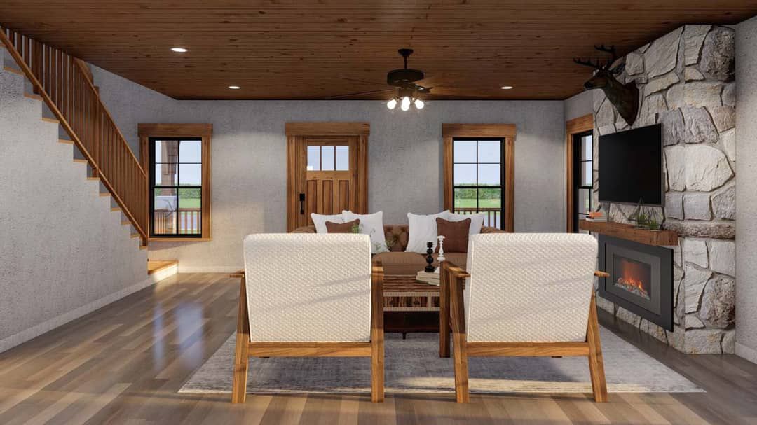 This plan combines the intimacy and low-maintenance footprint of a two-bedroom home with the bonus of a finished basement and bonus space—rare features in this size class. The rustic exterior and generous porches invite nature in, while the thoughtful layout supports both everyday living and future flexibility.