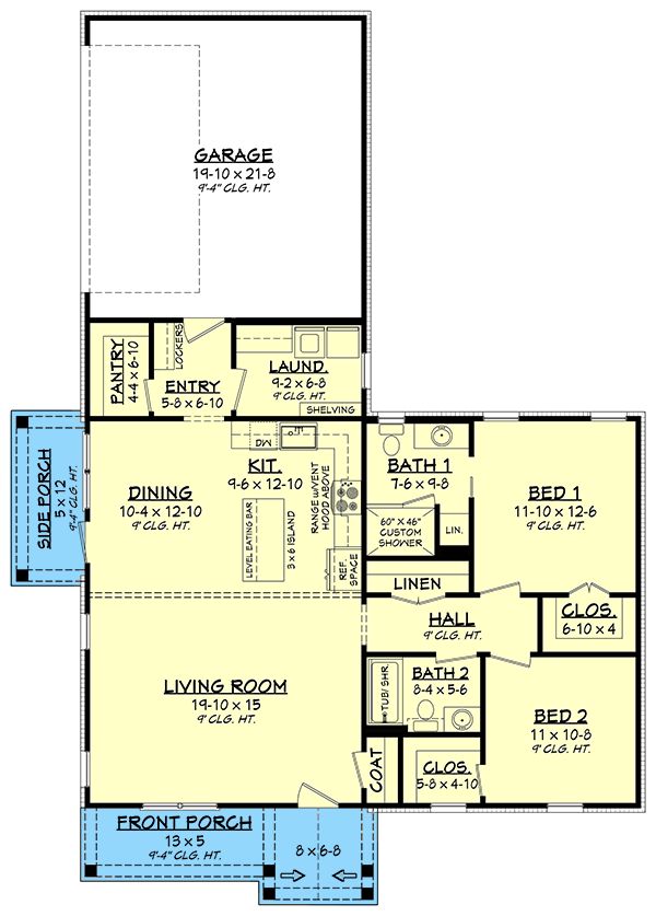 The home uses 2×4 exterior wall construction (with an optional upgrade to 2×6) and a ceiling height of 9′ on the main floor. 9 Efficient design principles — narrow overall depth, compact footprint, minimal hallways — all help to reduce construction and operating costs.