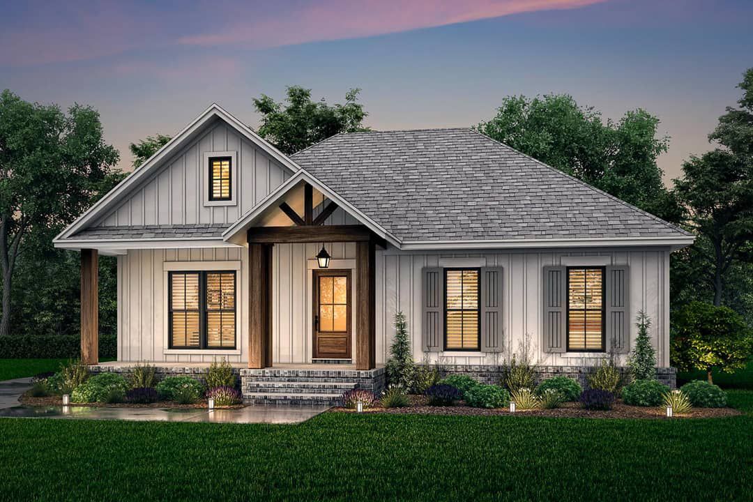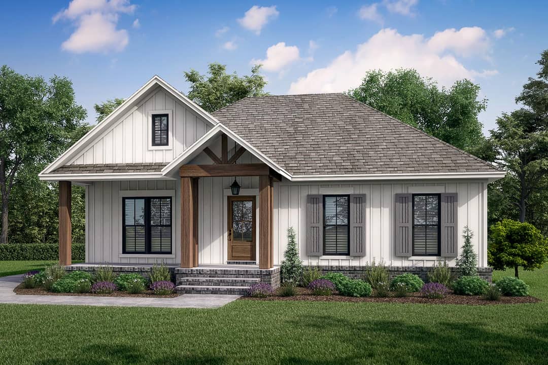 A striking Craftsman façade features board-and-batten siding accented with brick trim and timber columns at the covered entry. 1 A broad front gable adds curb appeal, and the porch shelters the entrance while the garage tucked at the rear preserves the clean front elevation. 2