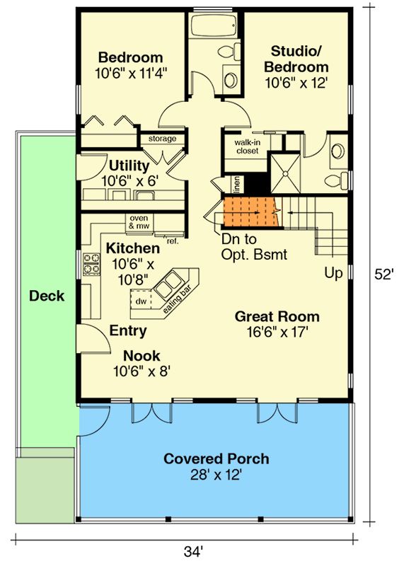 While the footprint remains modest, the kitchen is thoughtfully designed with an efficient layout. It faces the great room, so the cook stays connected to the activity. A peninsula or island configuration gives counter space without consuming square footage.