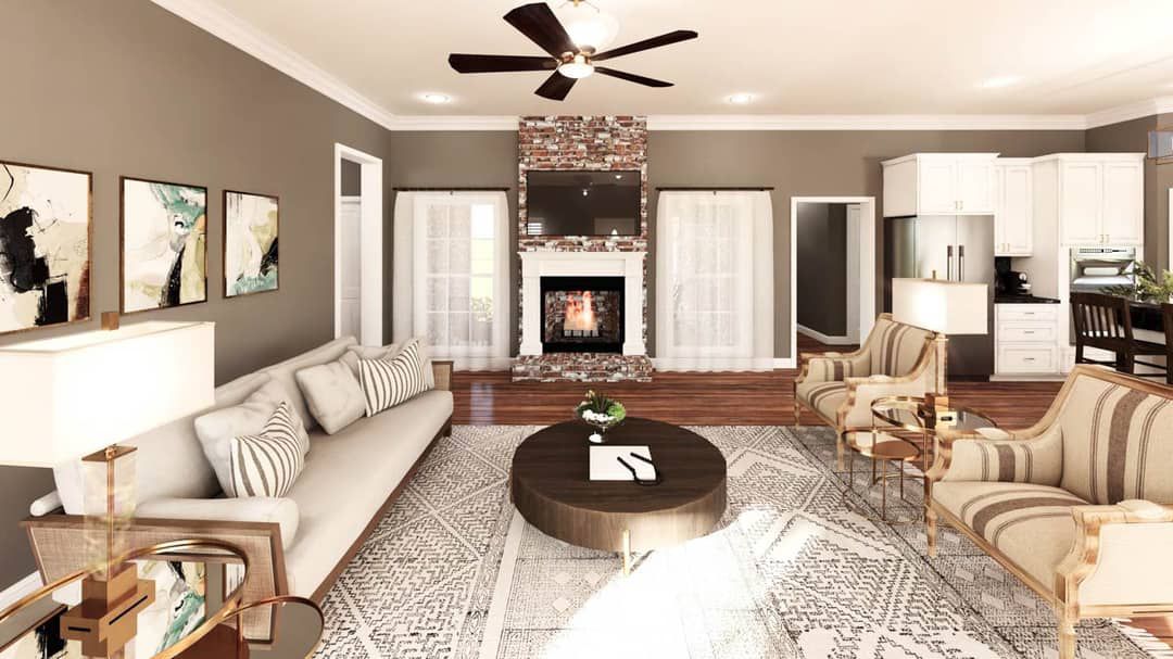 The great room is the heart of the home, scaled to feel generous thanks to the vaulted ceiling and large windows. The fireplace (if included) anchors the living area and adds rustic charm. Visibility into the dining and kitchen zones makes this space ideal for both casual living and entertaining.