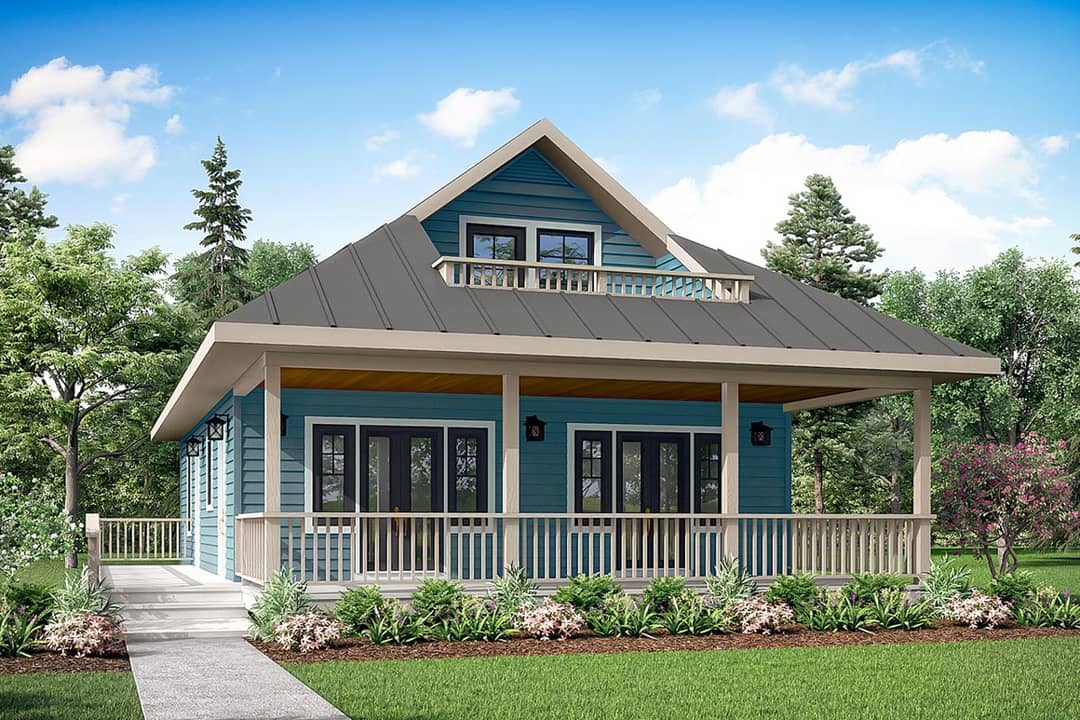 It’s hard to overstate the value of a plan that offers two full baths, adaptable sleeping space, an expansive great room with high ceilings, and generous outdoor living—all under roughly 1,120 sq ft main area. The bonus room above gives extra flexibility without expanding the footprint.