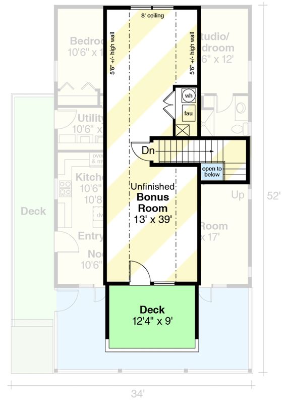 The home’s footprint measures **34′ wide × 52′ deep**, with a maximum ridge height of **23′ 0″**, making it both compact and visually bold. 1