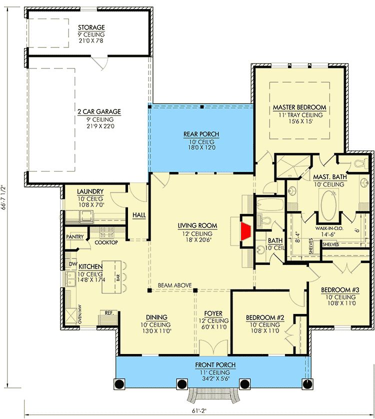 The home’s footprint spans about **61′ 2″ wide × 66′ 8″ deep**, with a maximum ridge height of **26′ 3″** — a generous yet balanced scale for comfortable living. 1