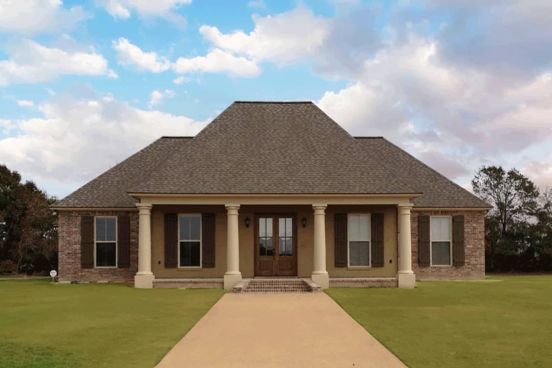 Four substantial columns support the deep covered front porch (~188 sq ft), making a strong statement of Southern charm and providing shade and outdoor living space. 2