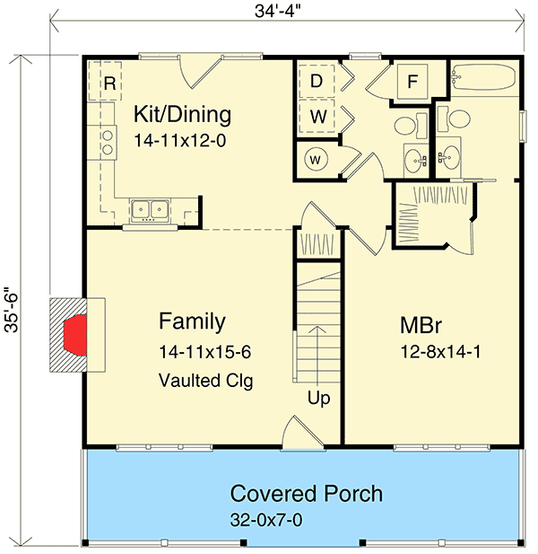 The home has a compact footprint — **34′-4″ wide × 35′-6″ deep** with a ridge height of ~26′. 2 The roofline is steep (12:12 pitch) and framing is standard 2×4, making it achievable in many settings. 3