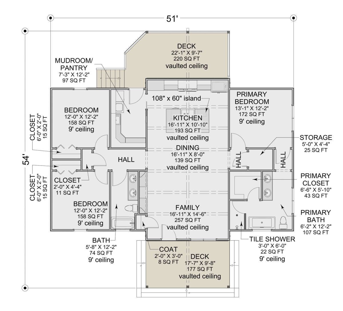 The front elevation spans about **51′ wide × 54′ deep**, creating a rectangular, efficient footprint. 1 A low-pitched gable roof (8:12) and 9 ft main-floor ceilings deliver scale without overwhelming height. 2