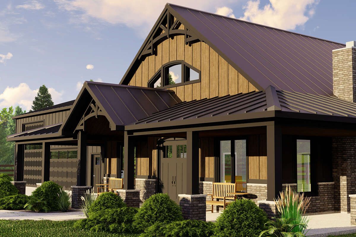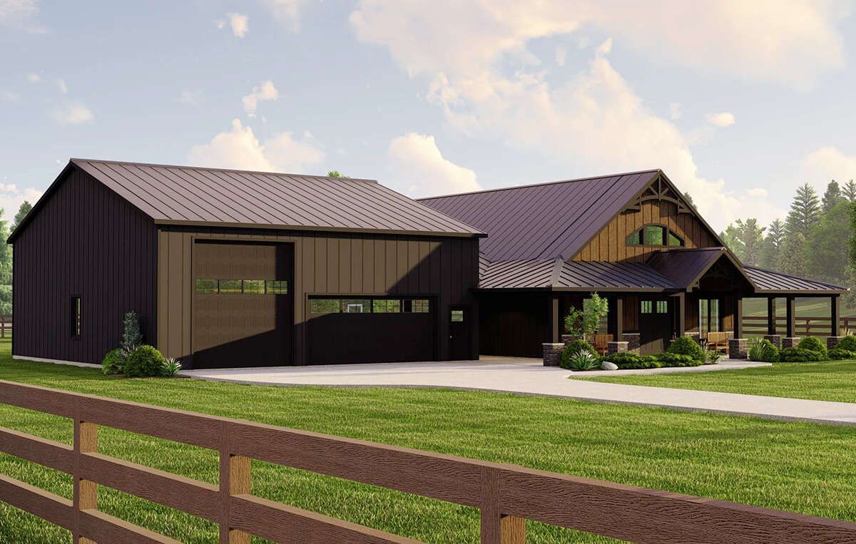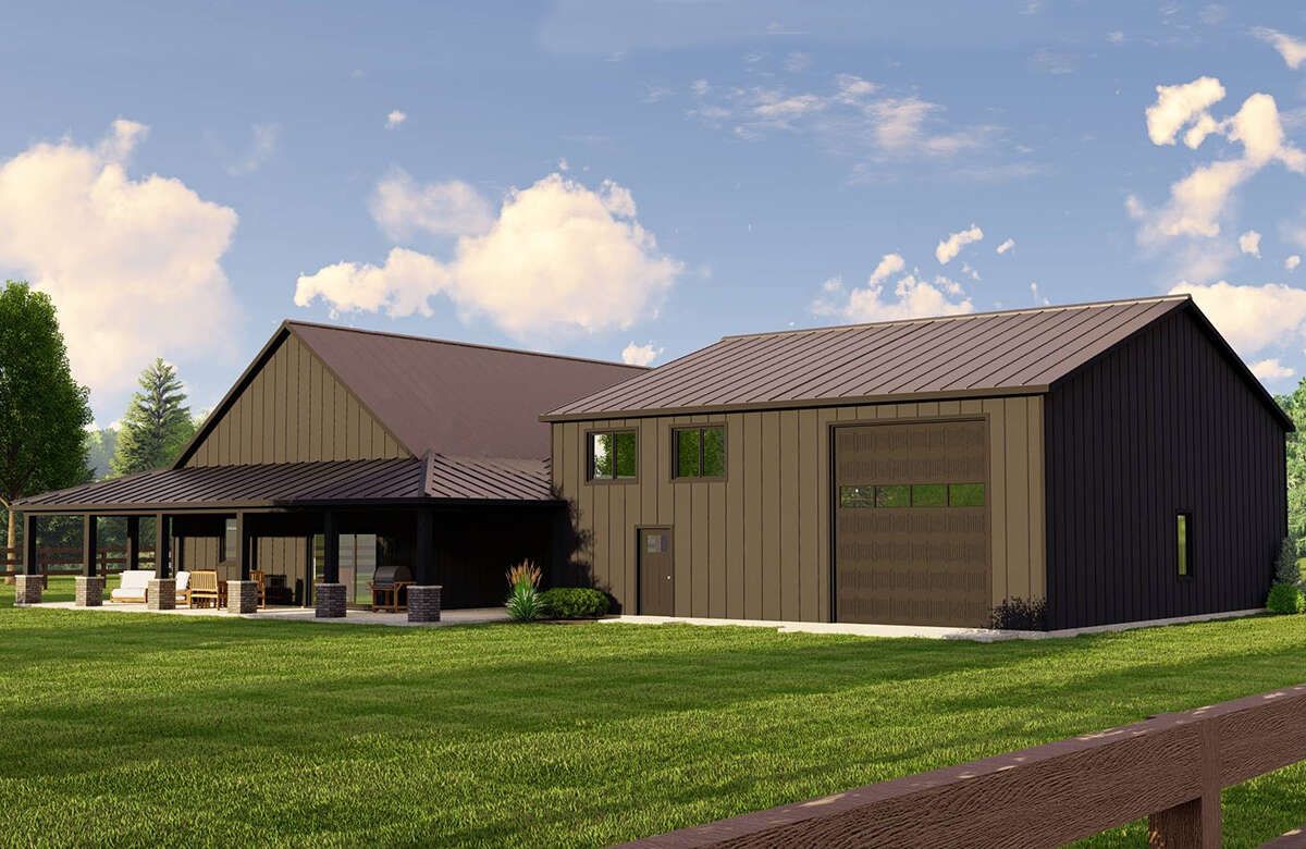 The exterior channels classic barn character: board & batten or vertical siding, oversized doors (potential for garage/workshop integration), and a lofty open roofline. A three-car garage bay is included, further enhancing the barn-versatility aesthetic. 3