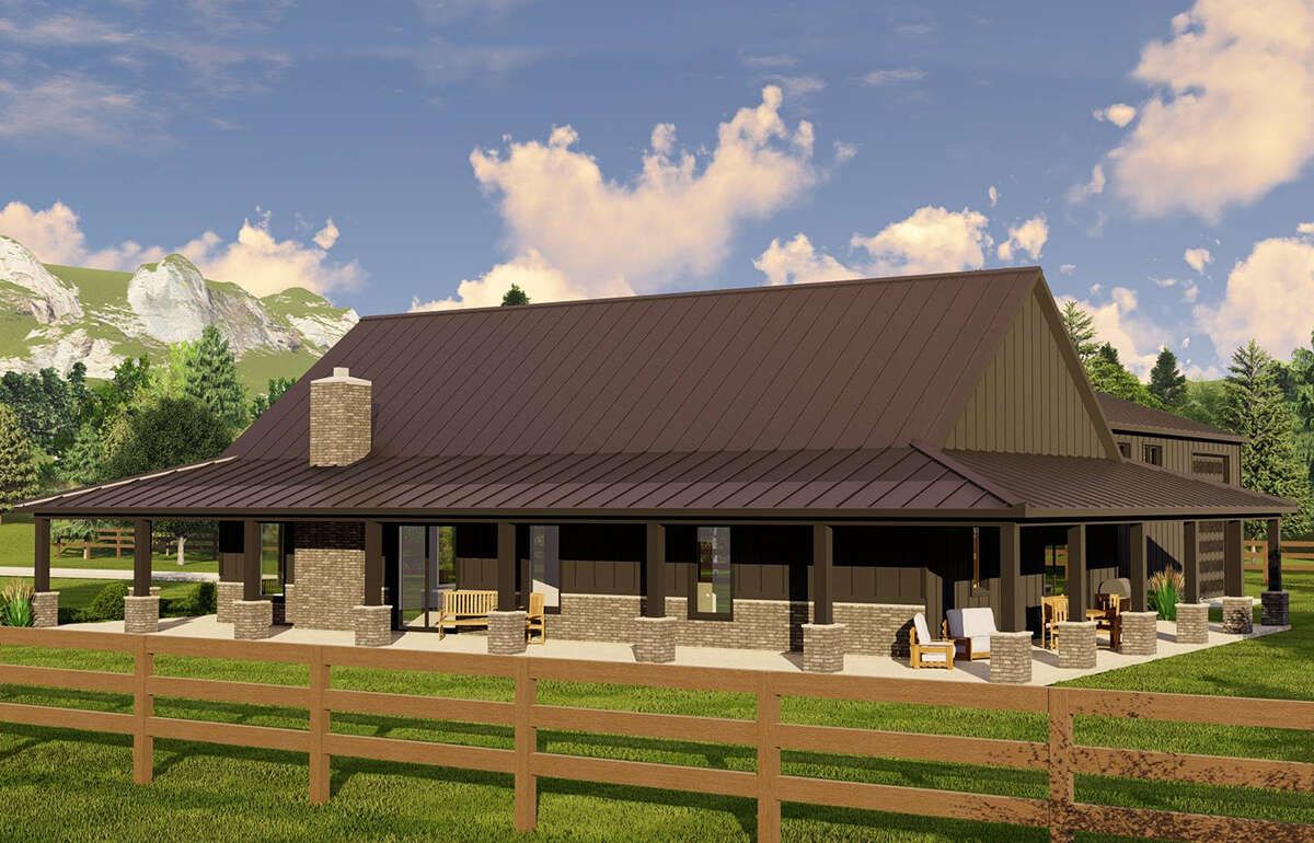 For homeowners who want something distinctive yet practical, this barn-style plan delivers both character and function. The wide footprint opens up possibilities for workshop space, detached-garage feel, or hobby bays without adding to the main living area. But it still offers three bedrooms and two baths in a single-level, efficient layout.