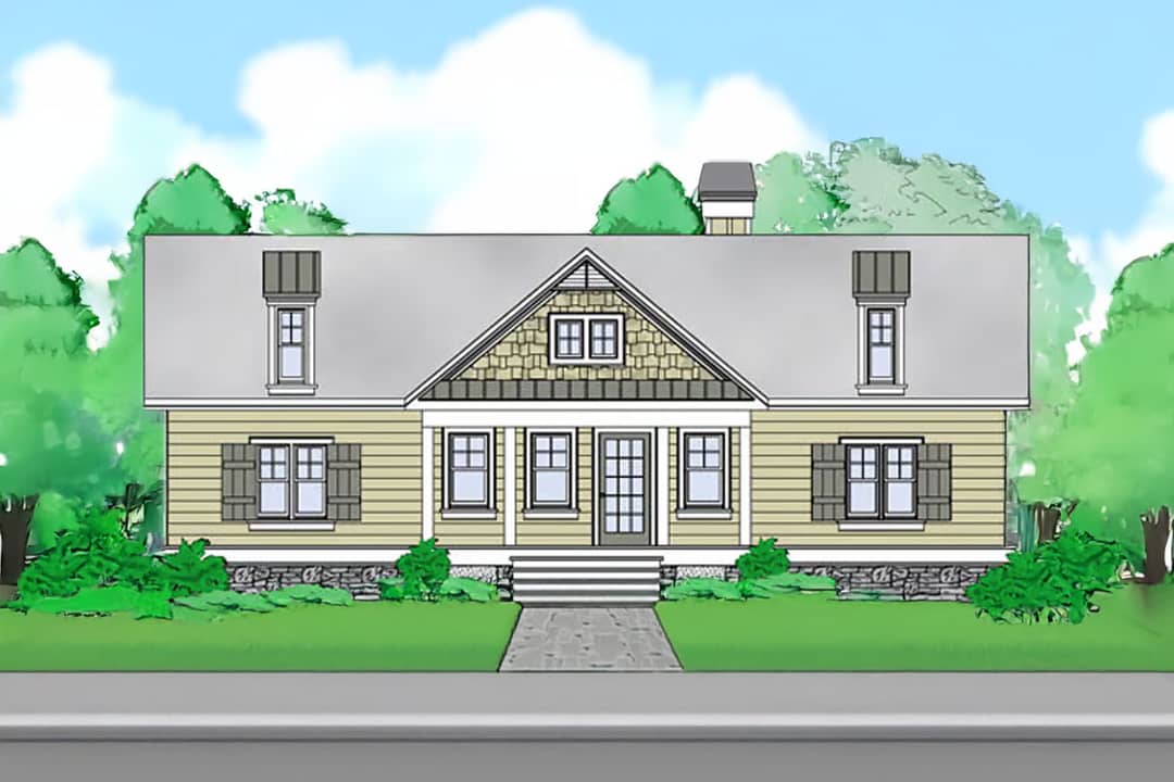 The home exhibits classic Craftsman cabin appeal with a broad front-porch, deep overhangs, and low-profile framing that blends beautifully into natural settings. The pitched roof transitions—from main 9 : 12 to secondary 10 : 12—add visual interest and volume without appearing oversized. 1