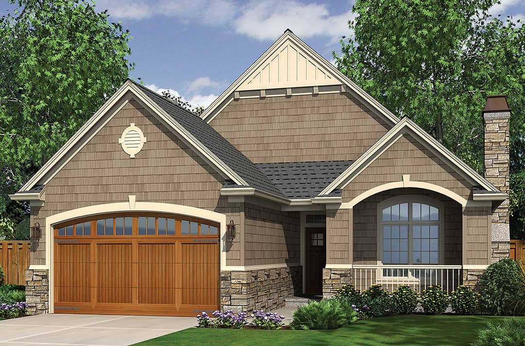 The use of mixed siding and stone/keystone details keeps construction interest high, while the compact size keeps heating/cooling loads and envelope costs manageable. The vaulted ceiling in the living room adds perceived space without substantially increasing volume.