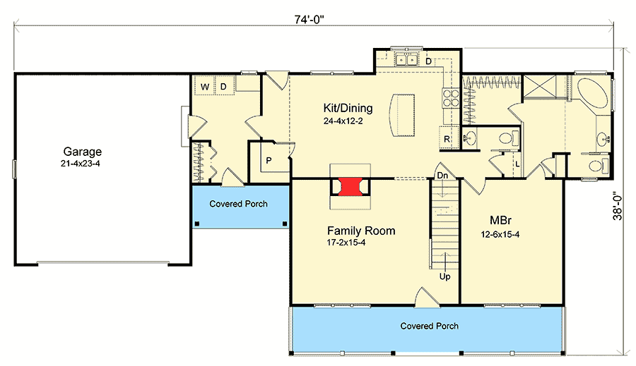 The home presents a broad **74′ wide × 38′ deep** footprint, ideal for a spacious lot frontage. 1