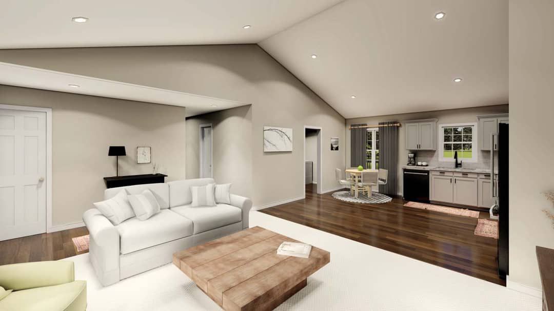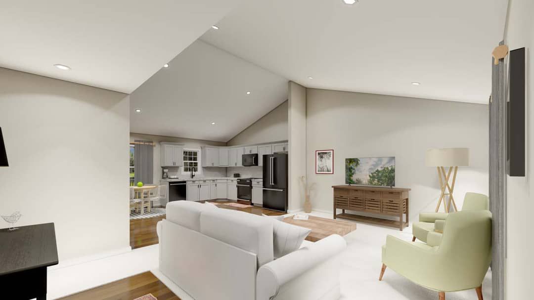 The generous great room is designed with volume in mind—vaulted ceilings and the fireplace draw attention, and the open layout encourages natural flow between living, dining and kitchen. 8