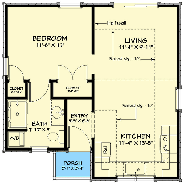 This plan masterfully balances minimal footprint with full small-home functionality. With a dedicated bedroom, full bath, laundry and open living space — all in under 550 sq ft — it delivers value without compromise. Ideal for ADU, guest house, rental unit or downsizing scenario.