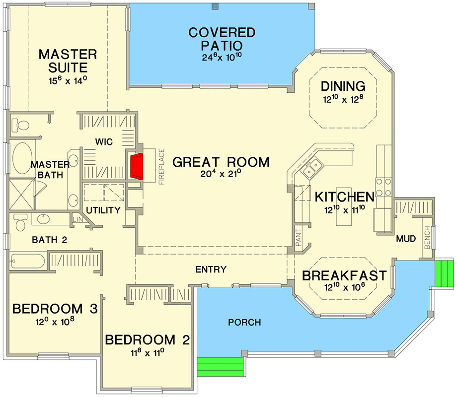 The great room serves as the heart of the home, anchored visually and functionally by the bay-window elements and broad sight-lines. The large size gives the “little ranch” more presence than the name might suggest. 8
