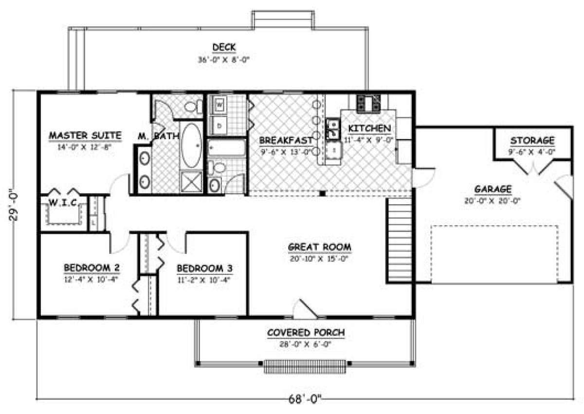 Although the plan focuses on indoor living efficiency, the wide frontage (68 ft) and moderate depth (29 ft) provide opportunities for front or rear porches or patios without significantly increasing footprint. Outdoor access from the living/dining zone would enhance the sense of space and offer an inviting extension for relaxation or entertaining.