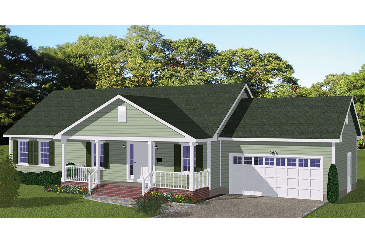 The exterior presents a classic ranch-style country home with a façade width of about 68 feet and depth of 29 feet. 1 The front-entry two-car garage anchors one side, while the remaining width allows for a balanced front elevation of siding, modest overhangs, and a welcoming entry. The single-story profile keeps the home grounded and approachable.
