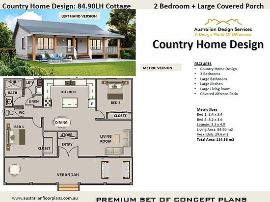 This compact yet thoughtfully designed country home offers approximately 84.9 m² (≈ 915 sq ft) of living space, including 2 bedrooms and 2 full bathrooms, complemented by a covered verandah.