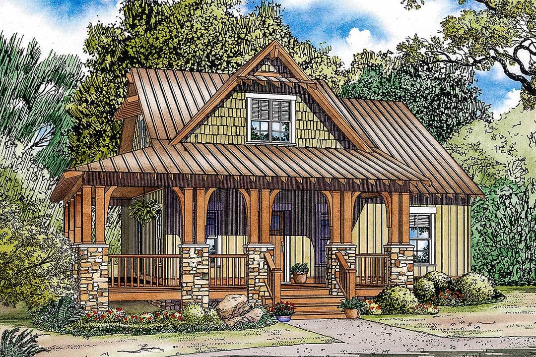 The façade perfectly balances rustic character with cozy proportions. Horizontal siding, natural wood posts, and stone or brick accents define the front elevation. The L-shaped covered porch wraps around the main entry and side, creating inviting outdoor space for rocking chairs, potted plants, and morning coffee. The porch depth averages 8′, providing ample shelter and curb appeal.