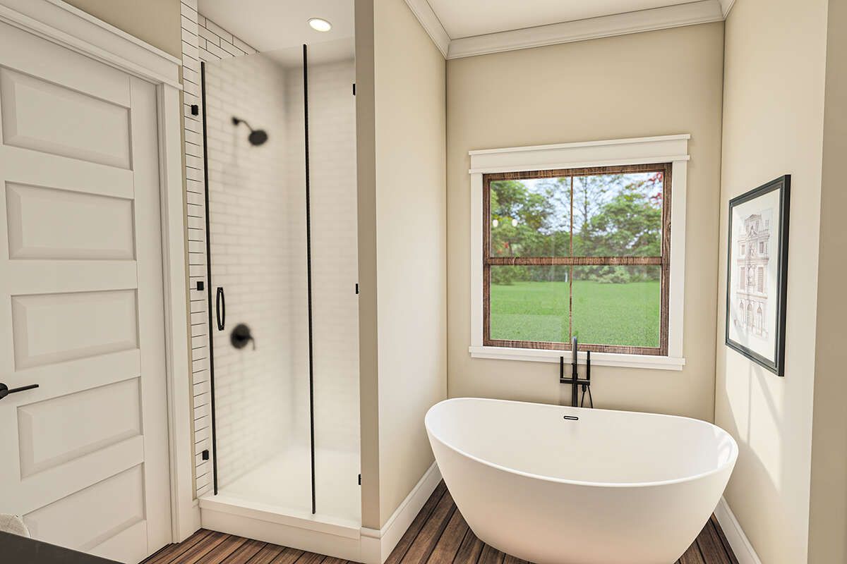 The main-floor master suite is designed as a peaceful retreat with a spacious layout, a large walk-in closet, and a luxurious ensuite bathroom. The master bath includes a dual-sink vanity, a soaking tub, and a separate shower—creating a spa-like environment for relaxation.
