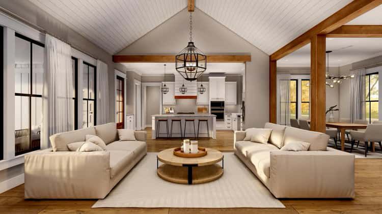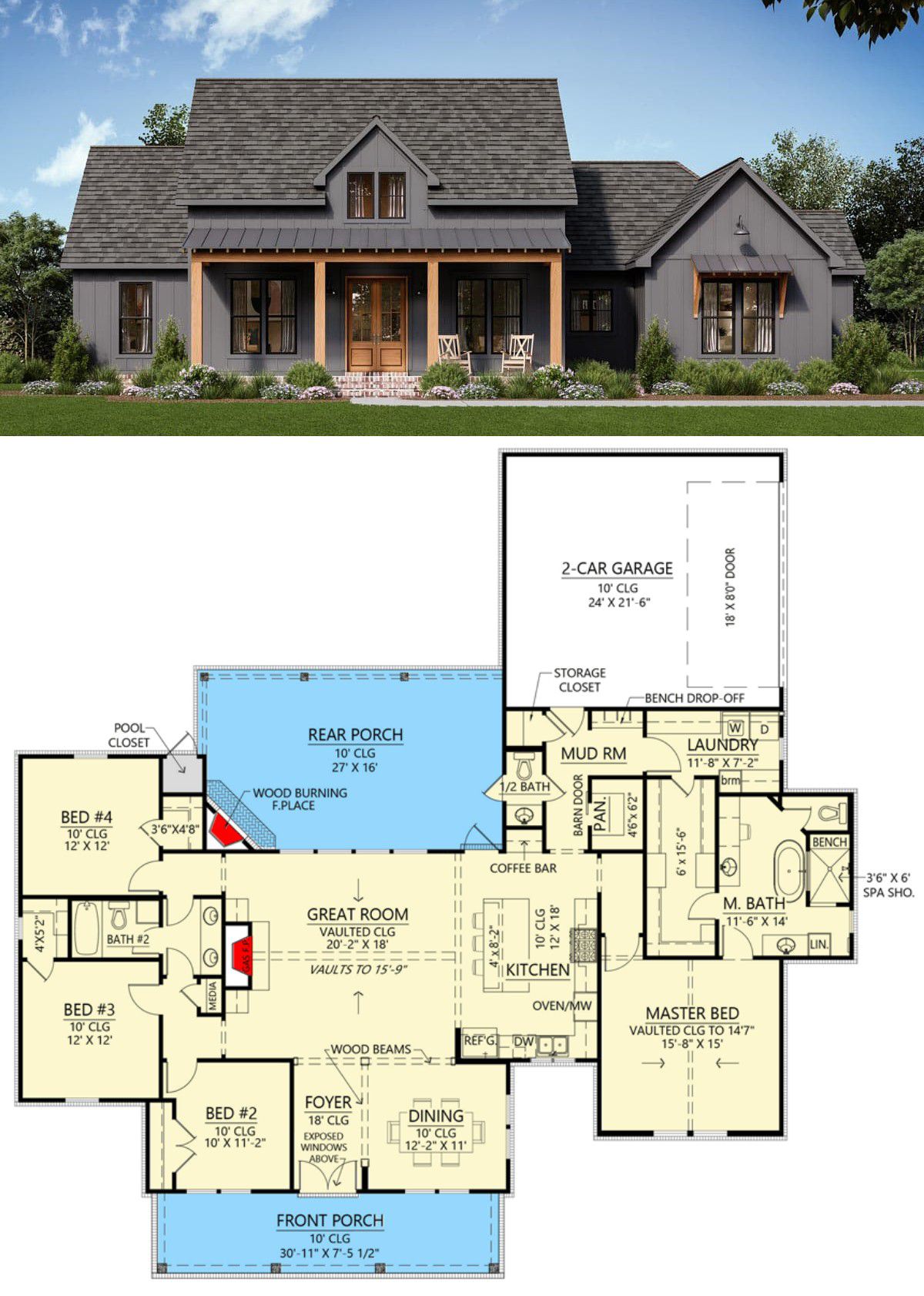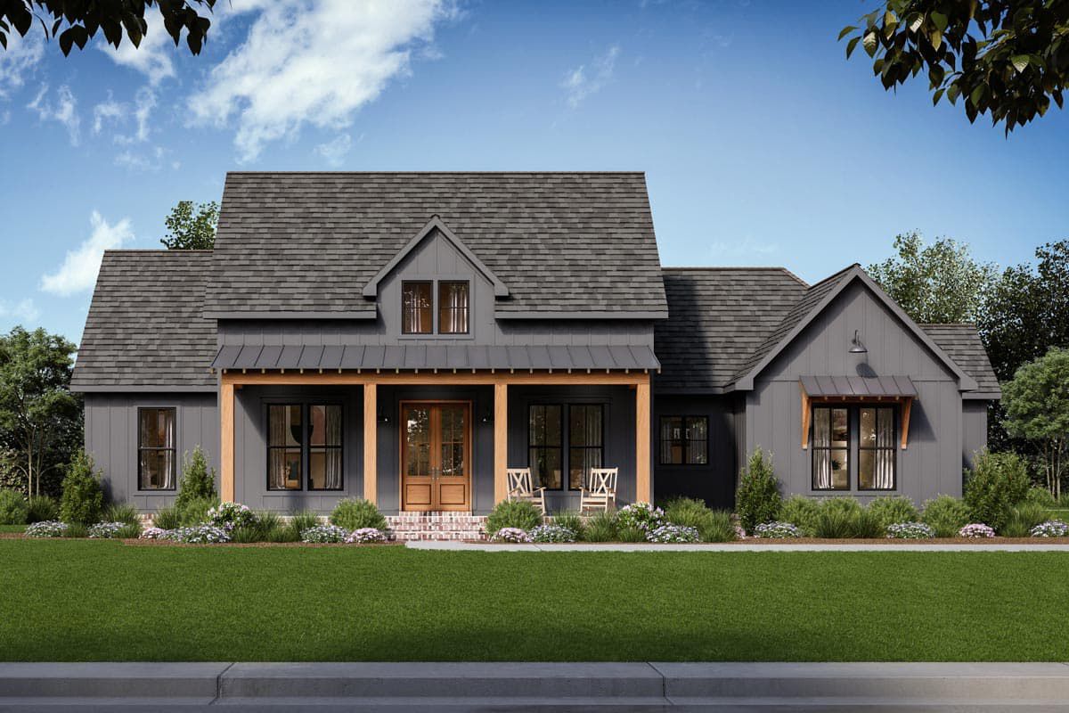- Highlights: Vaulted great room, rear porch, split bedroom wings, master-to-laundry closet, modern farmhouse exterior.