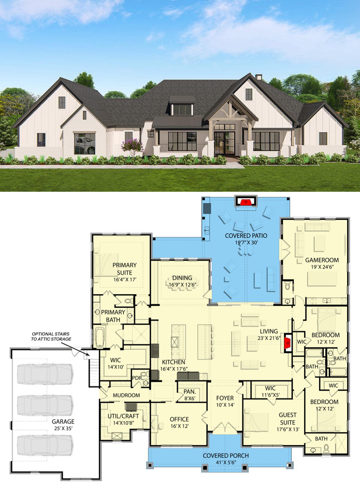 It offers the perfect blend of elegant style and practical layout: expansive yet manageable; dedicated zones for work and play; indoor-outdoor integration for entertaining; and master suite privacy. If you’re looking for a home that supports modern life—from remote work to family game nights—this plan checks those boxes without compromise.