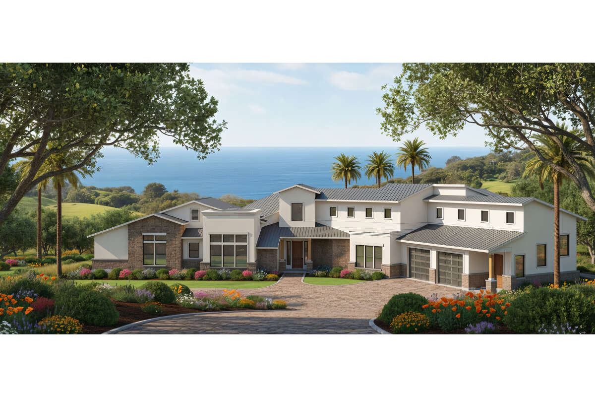 Inside, the plan embraces open living—great room, dining, and kitchen flow together effortlessly. High ceilings and expansive glazing bring in light and create visual connection to surroundings. The home’s 1.5-story structure adds spatial interest and potential for loft or bonus areas.