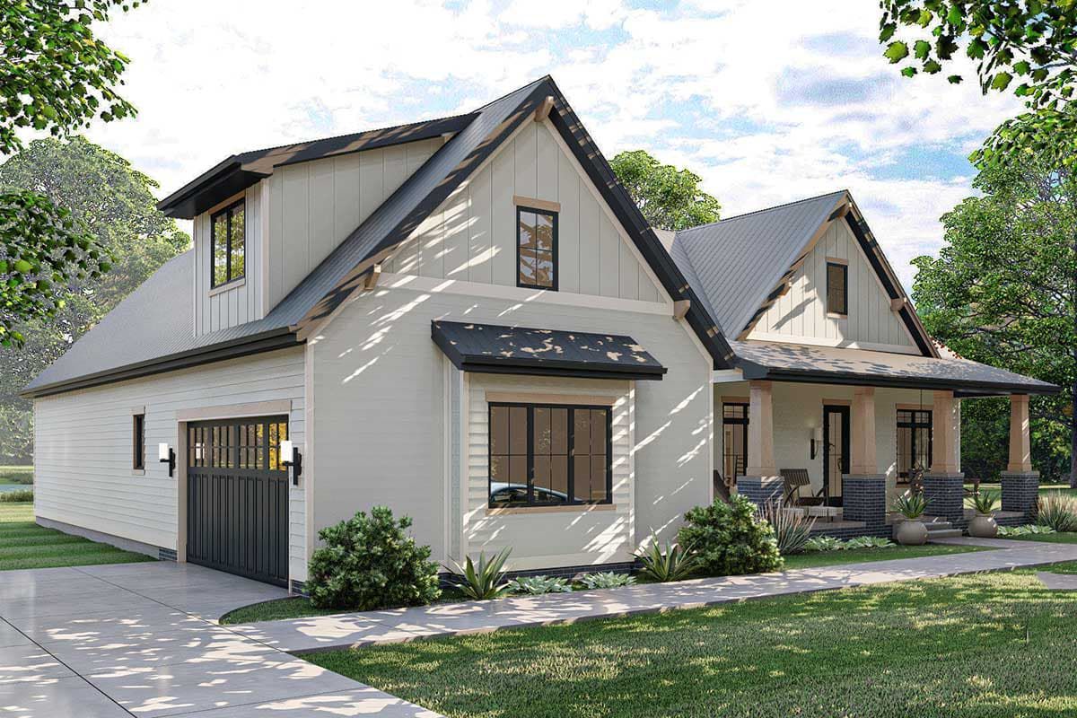 Featuring board-and-batten siding, a clean gable roof, and covered porch detailing, the exterior balances farmhouse familiarity with modern sophistication.