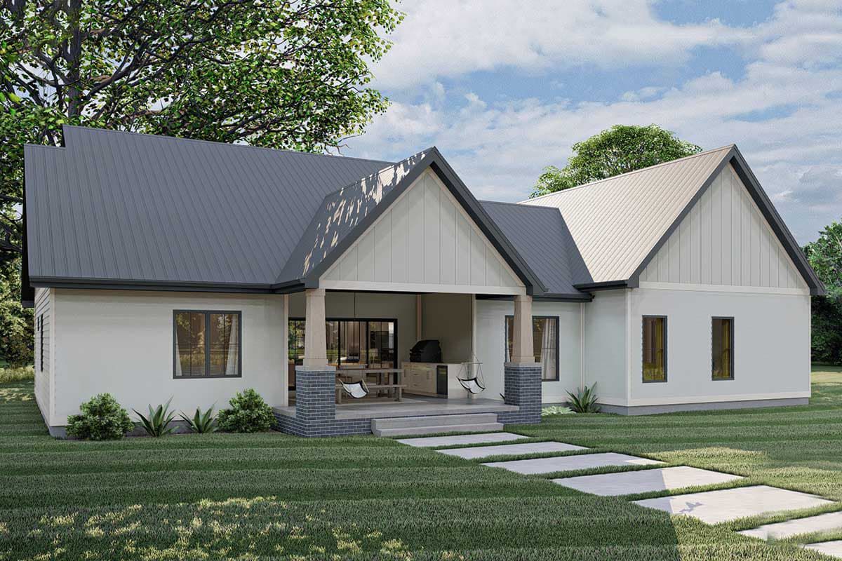 A covered rear porch extends from the dining/great room area, offering a shaded outdoor living area that’s perfect for relaxing or dining al fresco.