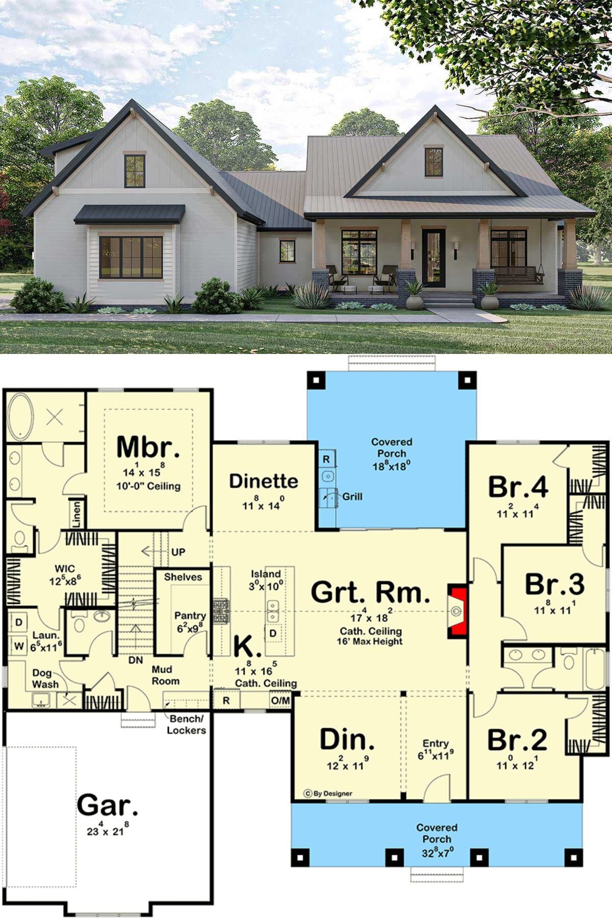 This single-level modern farmhouse packs about 2,483 sq ft of smart design, with 4 bedrooms, 2.5 baths, and a stunning vaulted great room that anchors the home.