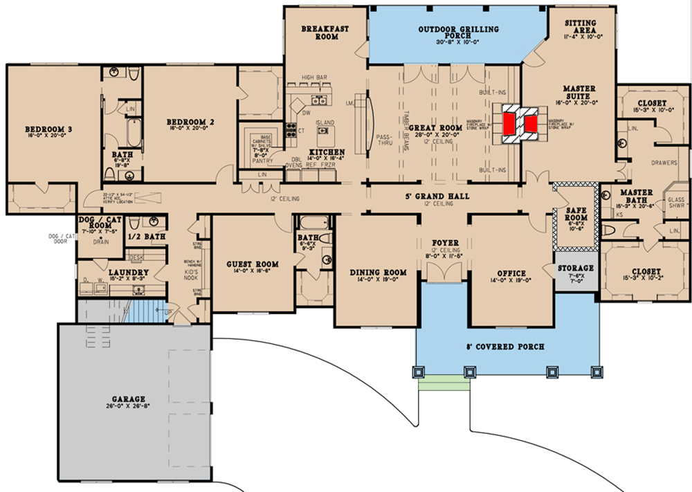 The master suite is a retreat: it includes a fireplace, sitting area, dual walk-in closets, and a luxurious en-suite bath with dual vanities and a custom tile shower. Plus, there’s a safe room just outside the master for security and peace of mind.
