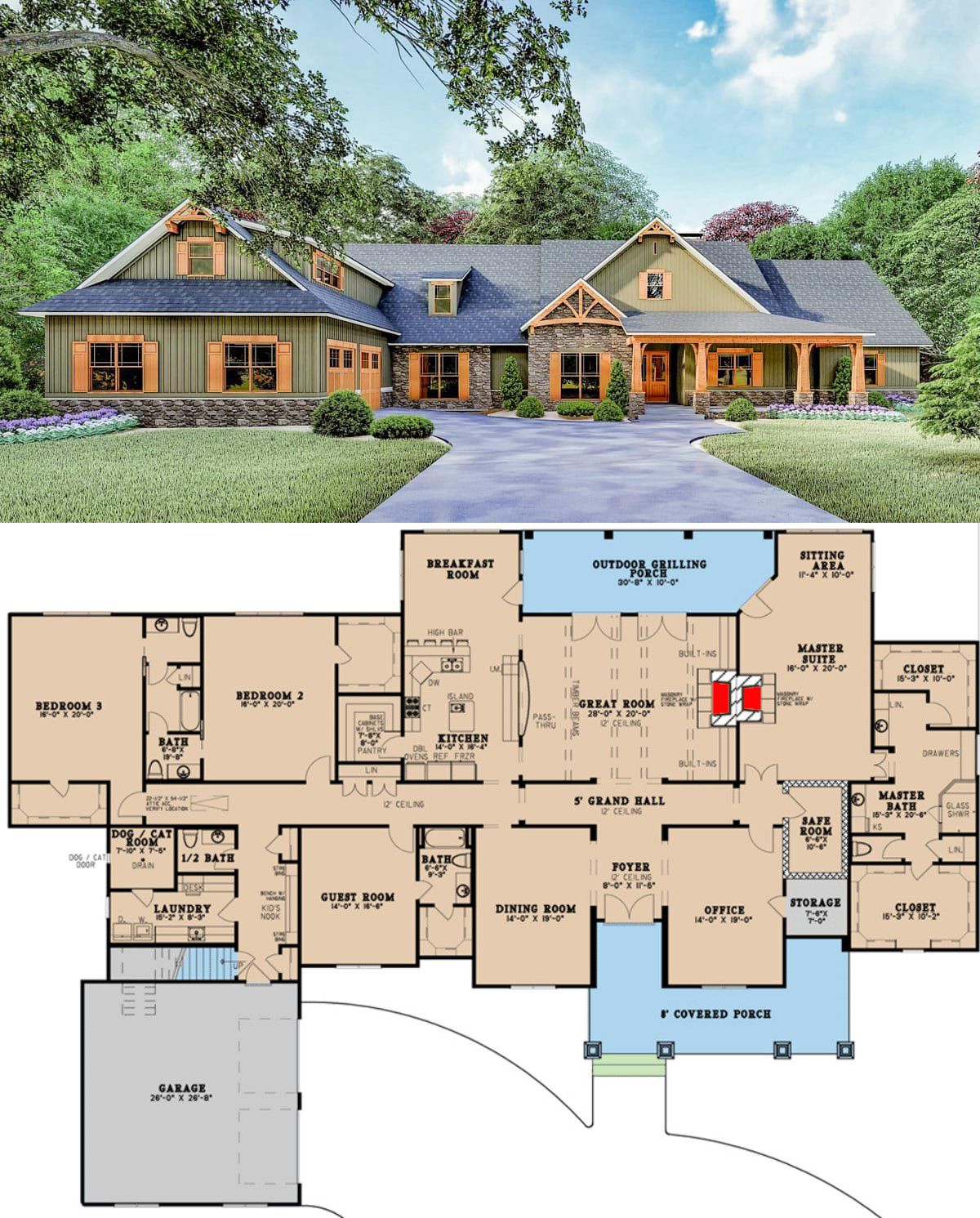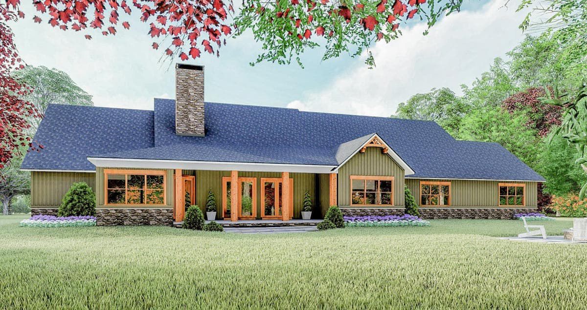 The exterior features classic Craftsman details: stone accents, timber trim, and a covered porch with French doors that invite you into the home.