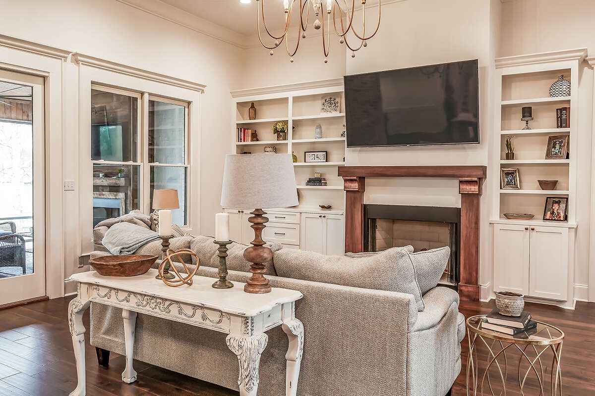 Walking in from the foyer or mudroom, the home flows into a large open-plan living area where kitchen, dining, and great room connect. The great room features high ceilings, a fireplace with built-ins or shelving, and large windows — making it a luminous, inviting space for family life and entertaining.