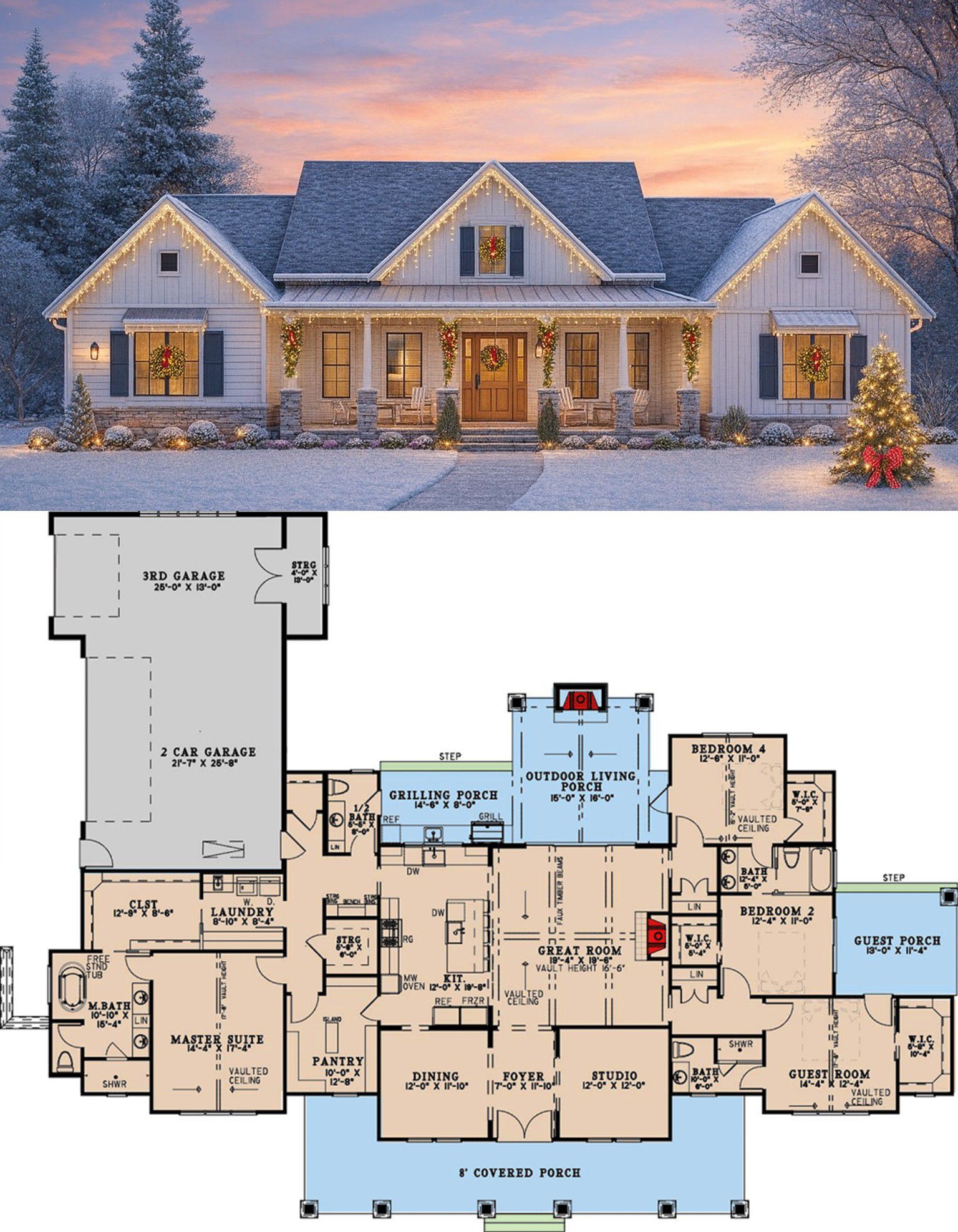 If you’re after a home that blends farmhouse charm with practical modern living — this 2,930-square-foot plan hits the sweet spot.With four bedrooms, 3.5 baths, and a 3-car garage tucked to the rear, it offers both space and smart layout flow.The split-bedroom design, vaulted communal spaces, and generous storage make this plan a comfortable, versatile pick for families or anyone wanting easy living with style.