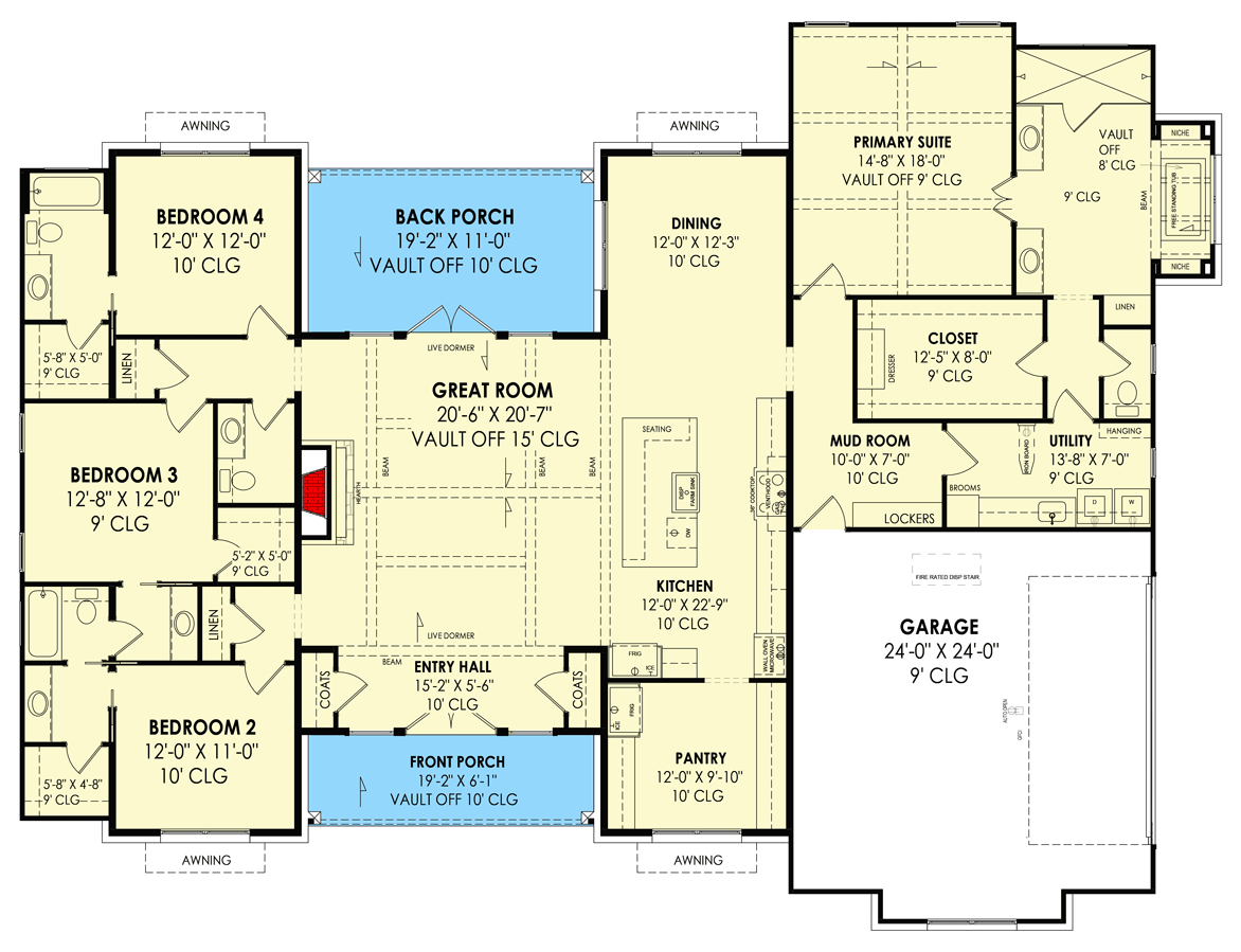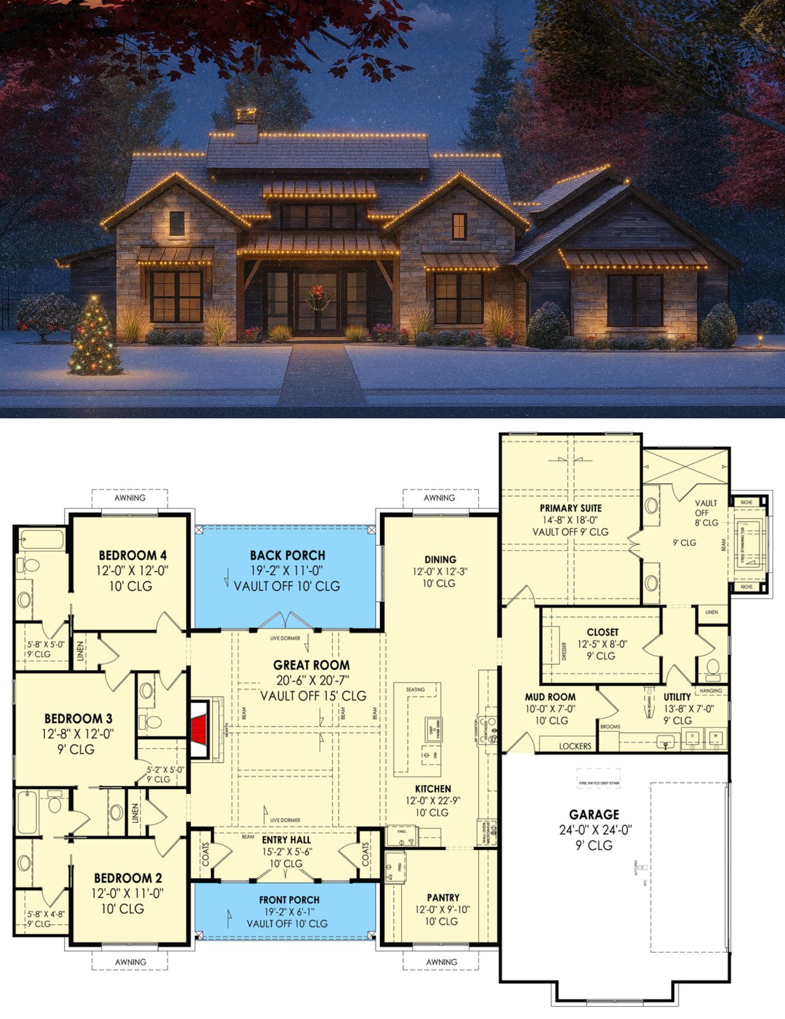This home plan is a strong fit if you want: a manageable-size home (under 3,000 sq ft) that still offers four bedrooms, good privacy separation, and a comfortable, open feeling for family life. The vaulted great room and open layout make it welcoming and airy, while the split-bedroom layout, master-suite privacy, and practical mudroom/garage entry keep everyday living smooth and organized.