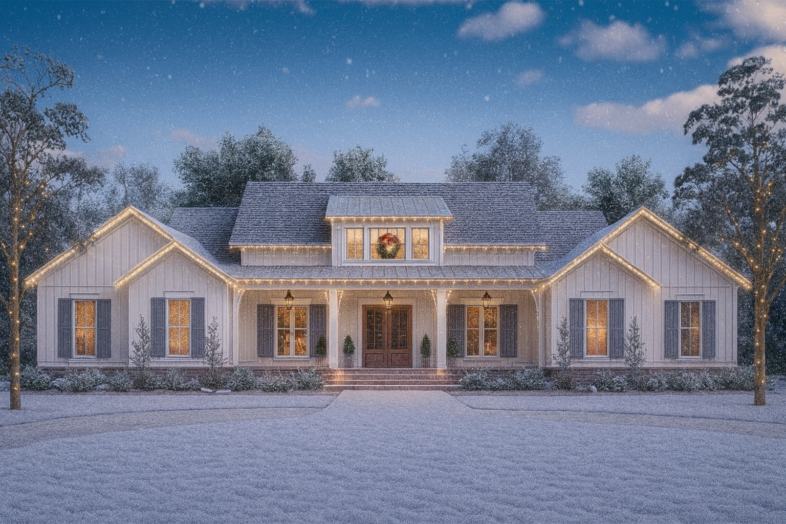 The home’s exterior presents a beautifully symmetrical, balanced facade — with a front porch entrance flanked by matching gables and a broad shed dormer above, giving it that clean, modern-farmhouse look. 7