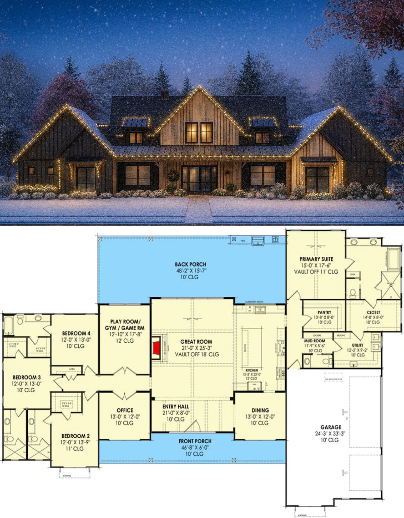 If you love farmhouse charm with a bit of rustic style and generous space, this 3,652 sq ft one-story plan delivers.