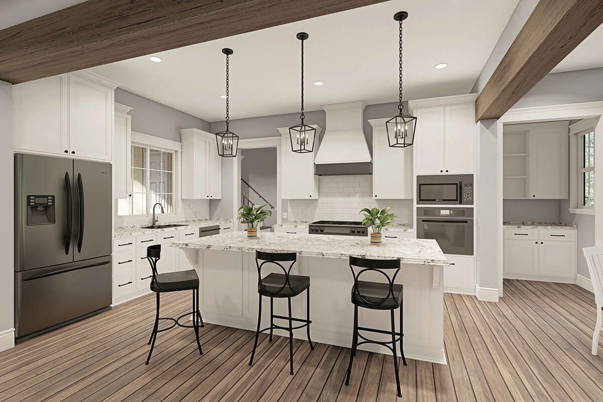 At the core of the house is an open area combining kitchen, dining, and the great room. The kitchen features a large 3′8″ × 8′ island with seating for four and easy access to a walk-in pantry — ideal for cooking, daily life, or hosting.