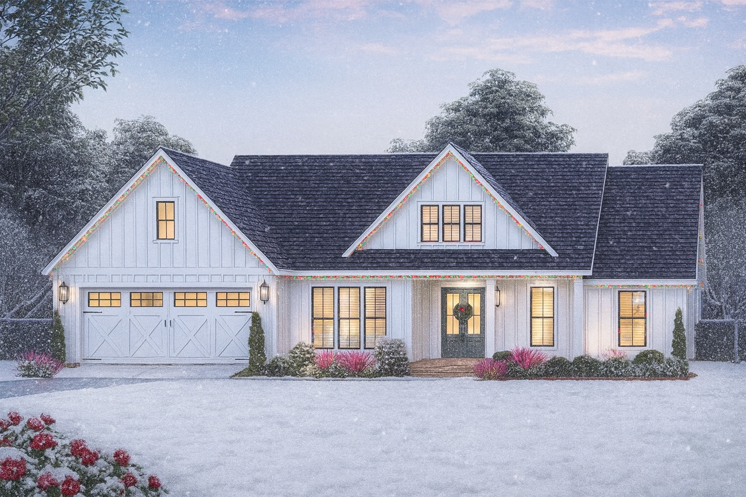 The exterior presents a modern-farmhouse look: board-and-batten siding, a decorative front-porch gable, and tall windows make for a home that’s both charming and contemporary.
