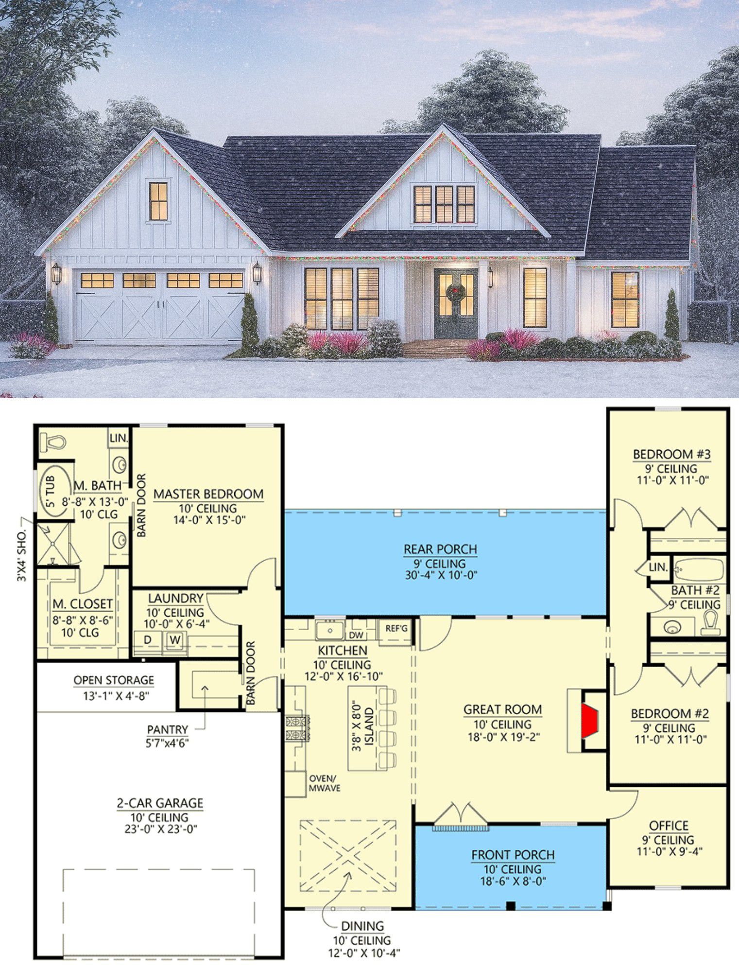 With three bedrooms, two full baths, a two-car garage, and even a dedicated home office — it’s a well-rounded plan for a small family, couple, or someone needing guest space and flexible use.