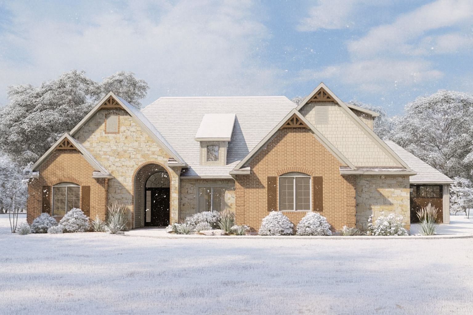 With four bedrooms, three bathrooms, a 3-car garage, and a bonus room above the garage, it’s a versatile plan suitable for families, guests, or future expansion — all wrapped in an elegant exterior with curved arches, mixed-material facade, and classic details.