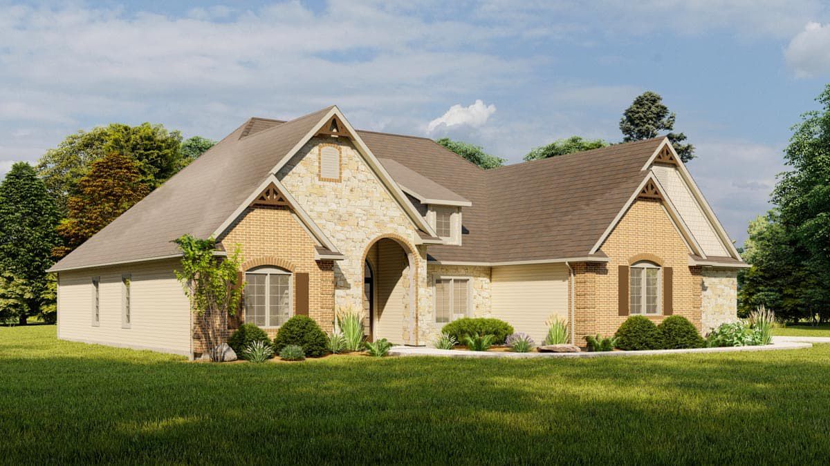 With four bedrooms, three bathrooms, a 3-car garage, and a bonus room above the garage, it’s a versatile plan suitable for families, guests, or future expansion — all wrapped in an elegant exterior with curved arches, mixed-material facade, and classic details.