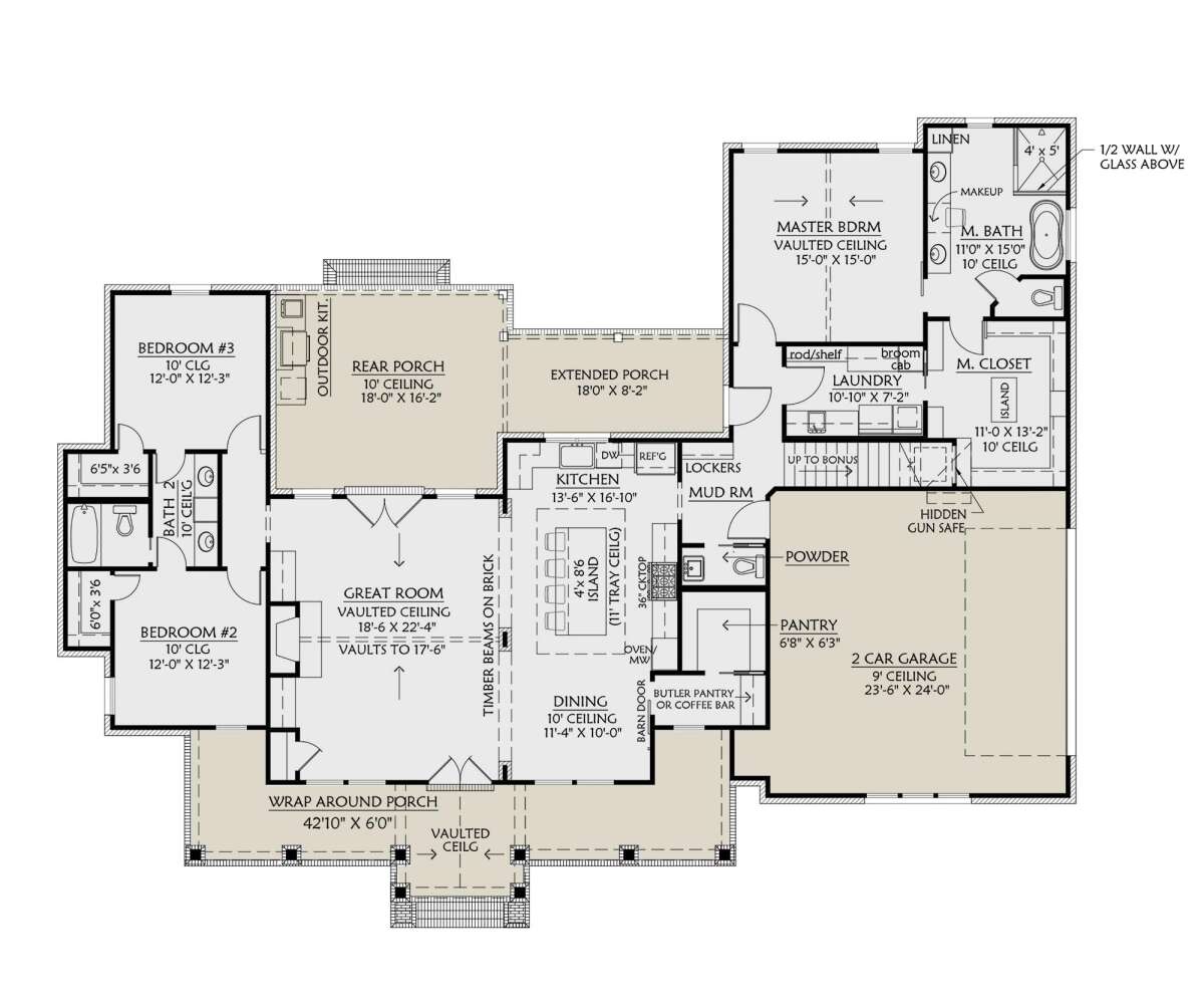 There are many homes on the market, but this design stands out because it combines classic beauty with functional living. You don’t have to choose between looks and livability — this house gives you both. From the timber beams in the vaulted ceiling to the thoughtful positioning of bedrooms, every inch of this layout is designed for comfort, elegance, and convenience.