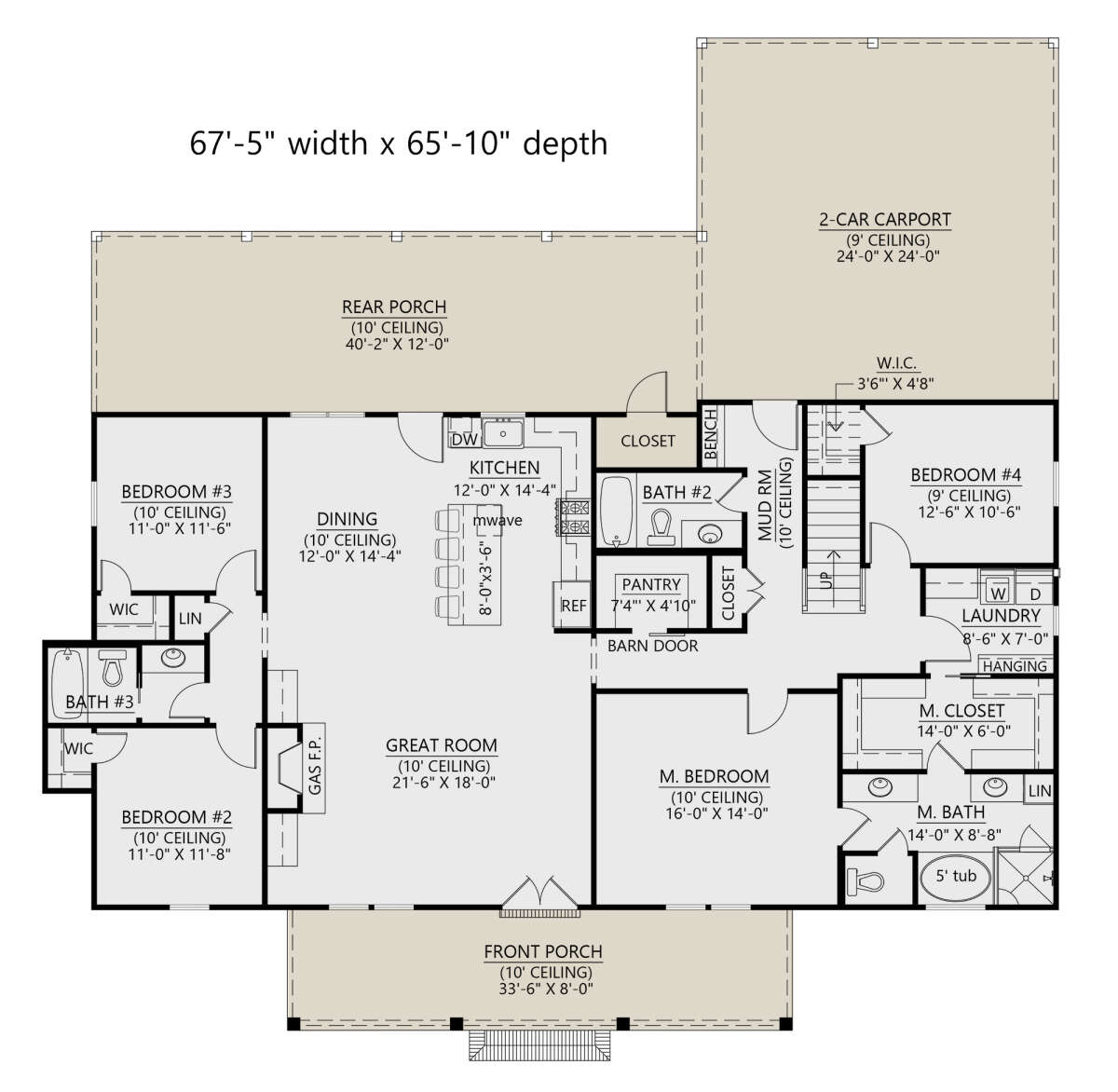 If you’re looking for a house plan that combines elegance, function, and modern comfort — all on a single level — this 67’5″ wide x 65’10” deep ranch-style home is a dream come true. Designed to suit both large families and homeowners seeking practical space, this beautiful layout blends open-concept living with private retreats and smart storage options.
