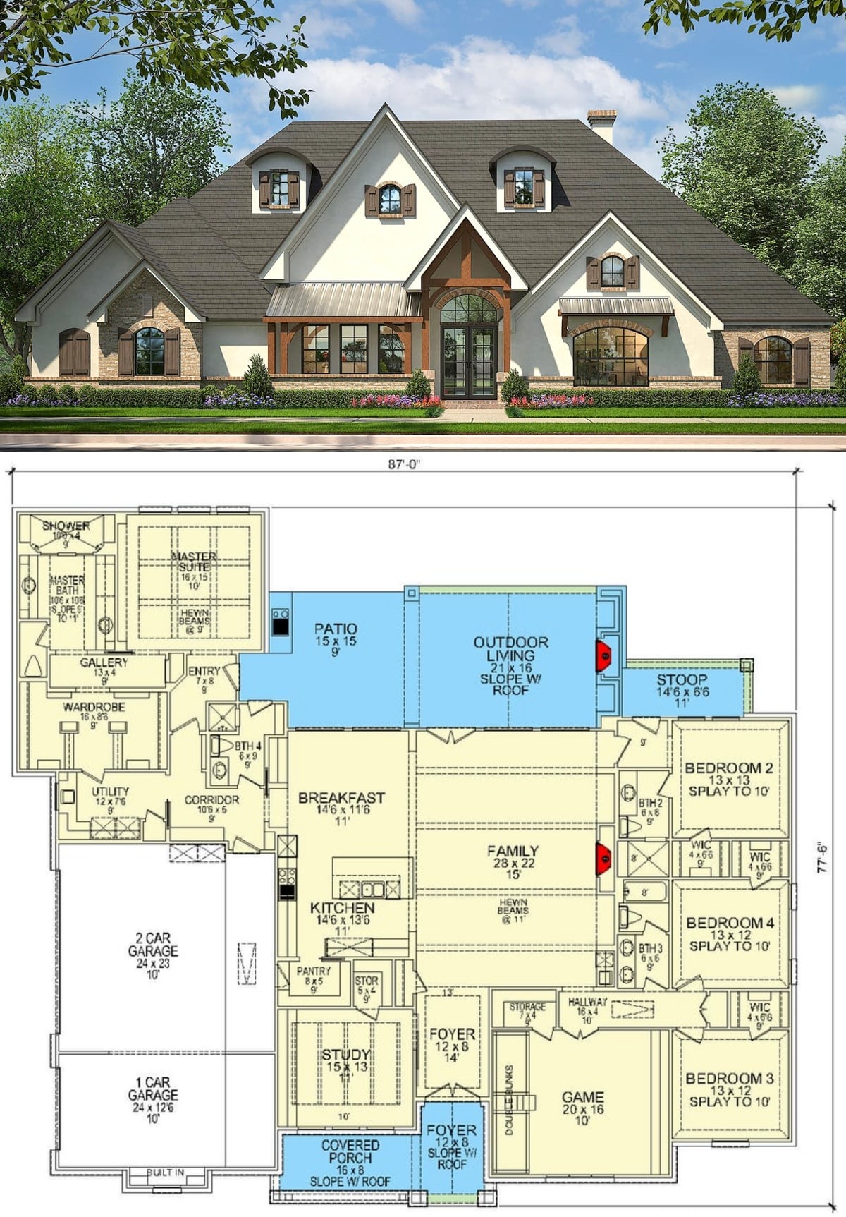 The outdoor living room is where this plan truly shines. Located at the rear of the home, it offers a large covered space with its own fireplace, perfect for cozy nights, game-day barbecues, or simply enjoying your morning coffee. This area connects directly to the main living room through large sliding doors, offering seamless indoor-outdoor living.