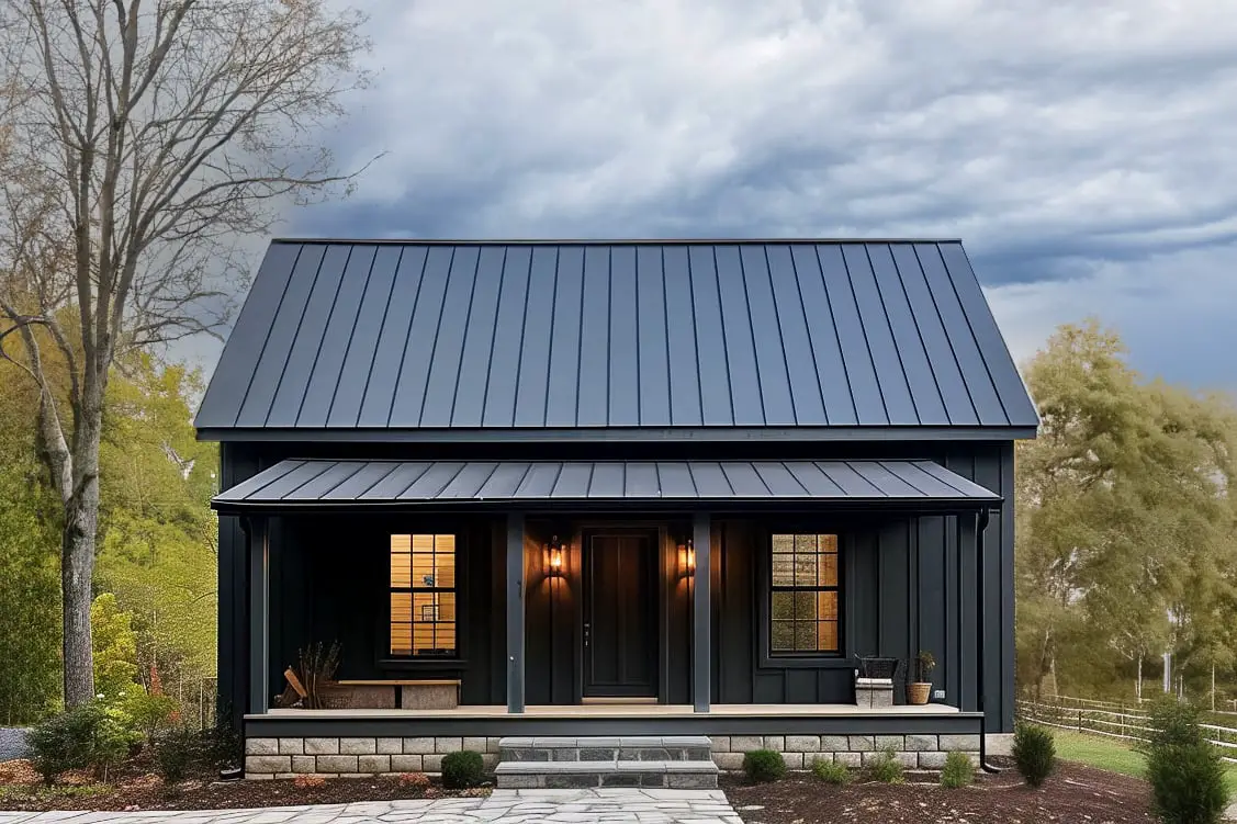 This ADU (Accessory Dwelling Unit) embraces classic farmhouse vibes with board and batten siding and a welcoming front porch. The simple gabled roof adds timeless elegance while keeping construction costs efficient.