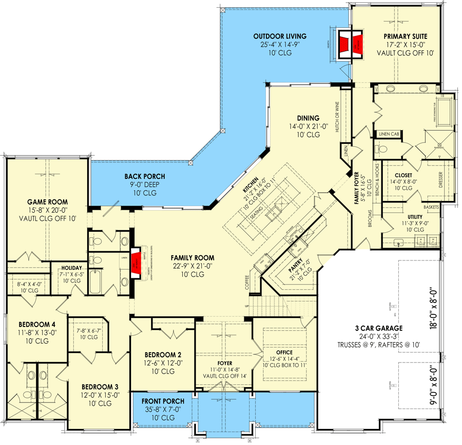 If you’re looking for a family home that’s as beautiful as it is functional, this transitional-style design is a perfect match. From its symmetrical exterior to its flexible interior layout, every inch is crafted with care.